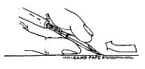 この調整方法は上記の方法でもリードが軽くならないとか開きが収まらない場合だけにしてください。まず、リードのサイドを押さえてリードの開きを最大にしながら耐水ペーパーをケーンの間に挟み込み、できるだけ根元まで入れます。
