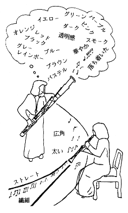 | あなたの持つ音色か理想の音色を頭の中に 思い浮かべてください。 色は何色ですか?落ち着いた色ですか? それとも派手な色ですか? 濃い色ですか?それとも淡い色ですか? 透明感がありますか?それとも スクリーントーンの感じですか? |