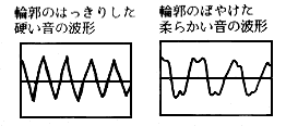 | 音程=波形の基本周期で決まります。 *緩やかだと音程は低く なります。 音量=波形の振幅で決まります。 *幅が広くなるほど音量は 大きくなります。 音色=波形そのものの形で決まります *複雑な形ほど明るくなります。 *波の曲がりが鋭角ほど シャープになります。 |